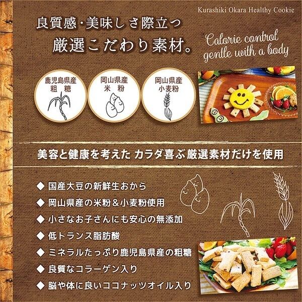 米粉(岡山県製造)、おから(国内製造)、マーガリン(乳不使用)、粗糖(鹿児島県製造)、豆乳(国内製造)、チョコレート(カカオマス)、アーモンドプードル、ココアパウダー、ココナッツオイル、コラーゲンペプチド/乳化剤、香料、(一部に大豆・乳成分・アーモンド・ゼラチンを含む)